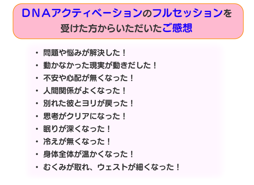 また、新月の日は朝から具合が悪いとか、頭痛などがあるのですが、今日は普通に過ごしています。DNAアクティベーションが効いているのでしょうか。毎回本当に辛いので(先月は辛さのあまり職場の個室で号泣しました)、すごく有難いです^^ DNAリーディングやアデプト等、他のヒーリングにも興味がありますので、また伺いたいと思っております。