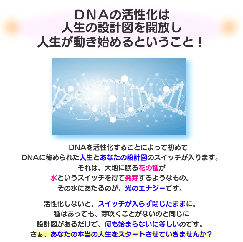 先日はDNAアクティベーションをしていだだき、有難うございました。色々お話させていただきながら、楽しい時間を過ごすことができました。まだ受けたばかりで「自分の眠っていた新しい可能性」への気づきという感じはないのですが、これまでの私は「自分の部屋があまり暗すぎて、他の可能性が(あったのに)見えていなかったんだな~」ということに気づきました(何かパラドックスみたいですが・笑)。そういえば、ここ数日ネガティブなことをあまり考えていないみたいです。。