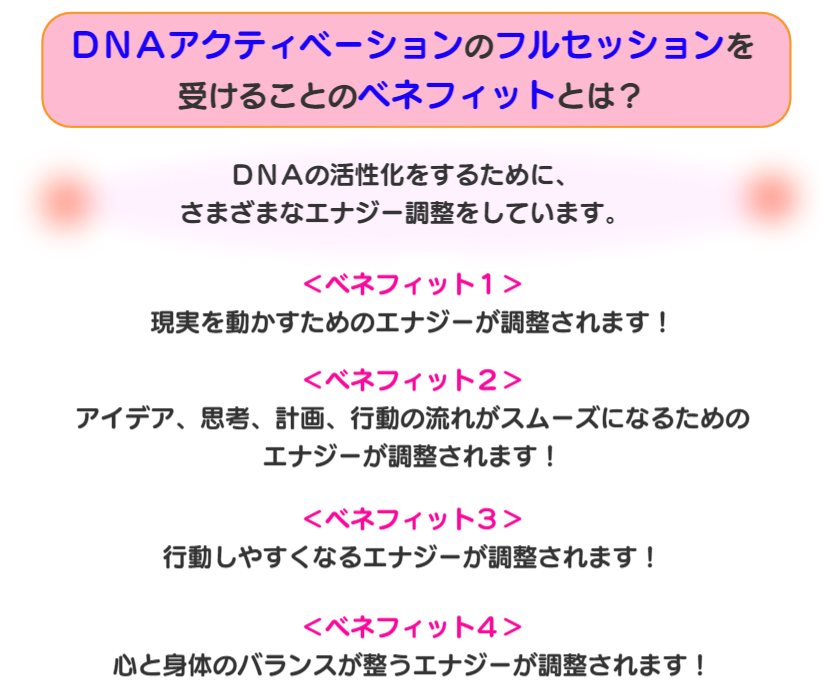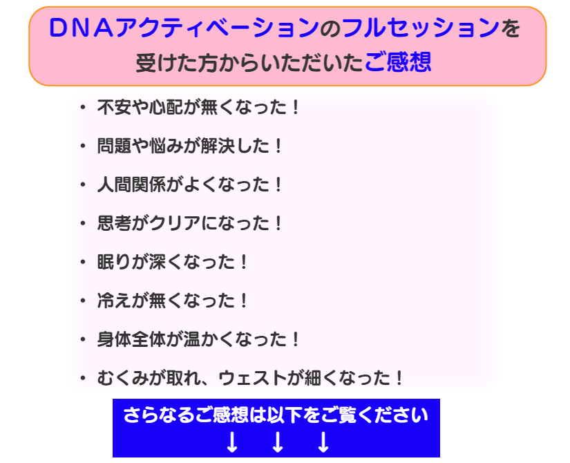 また、新月の日は朝から具合が悪いとか、頭痛などがあるのですが、今日は普通に過ごしています。DNAアクティベーションが効いているのでしょうか。毎回本当に辛いので(先月は辛さのあまり職場の個室で号泣しました)、すごく有難いです^^ DNAリーディングやアデプト等、他のヒーリングにも興味がありますので、また伺いたいと思っております。