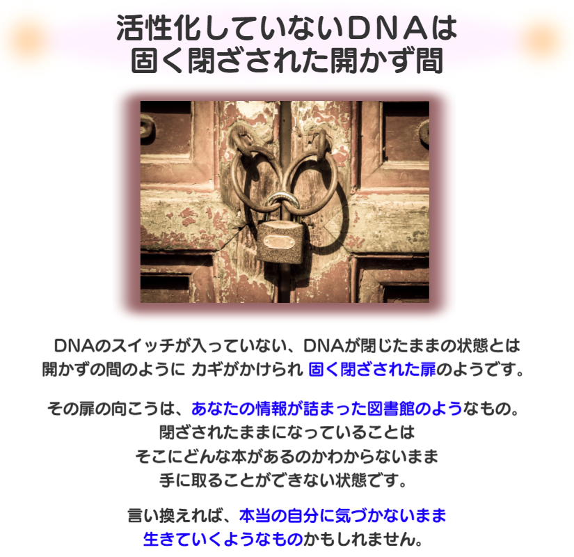 先日はDNAアクティベーションをしていだだき、有難うございました。色々お話させていただきながら、楽しい時間を過ごすことができました。まだ受けたばかりで「自分の眠っていた新しい可能性」への気づきという感じはないのですが、これまでの私は「自分の部屋があまり暗すぎて、他の可能性が(あったのに)見えていなかったんだな~」ということに気づきました(何かパラドックスみたいですが・笑)。そういえば、ここ数日ネガティブなことをあまり考えていないみたいです。。