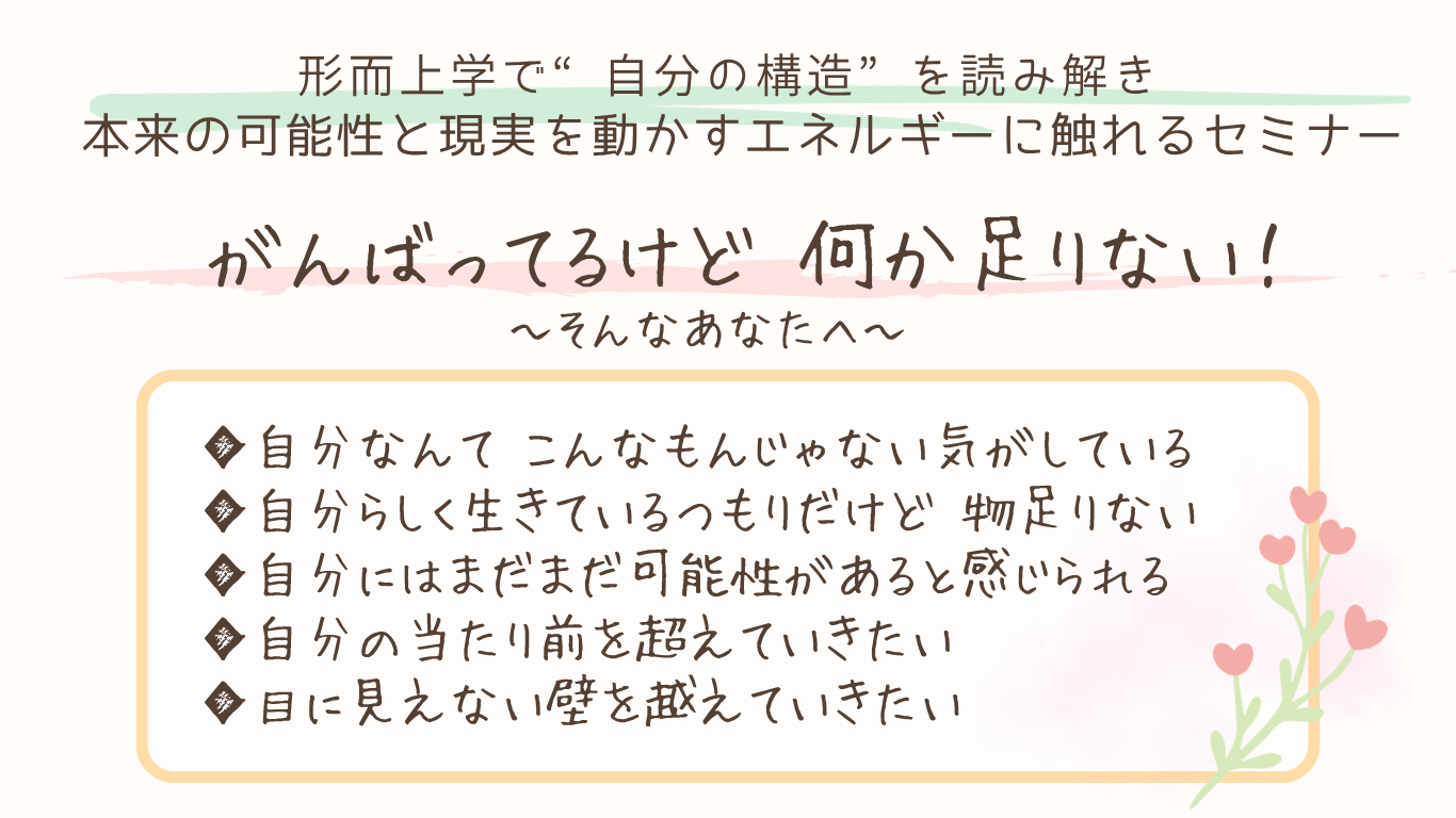<ミライへのリンク Beyond 概 要> ◎開催日時: 5月24日(日)13-16時◎定員:4人(少人数制) ◎料金: 5,000円 10,000円※Beyondスタート記念 5月だけの特別価格 <会場> ◎グレースランドルーム【吉祥寺】 お名前 * メールアドレス * 連絡先(お電話番号) * ※緊急時のみに使用します